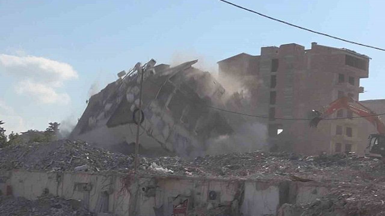 Hatay'ın Antakya ilçesinde 8 katlı bina iş makinesiyle halatla çekilerek yıkıldı. Binanın yerle bir olduğu anlarsa kameraya yansıdı.