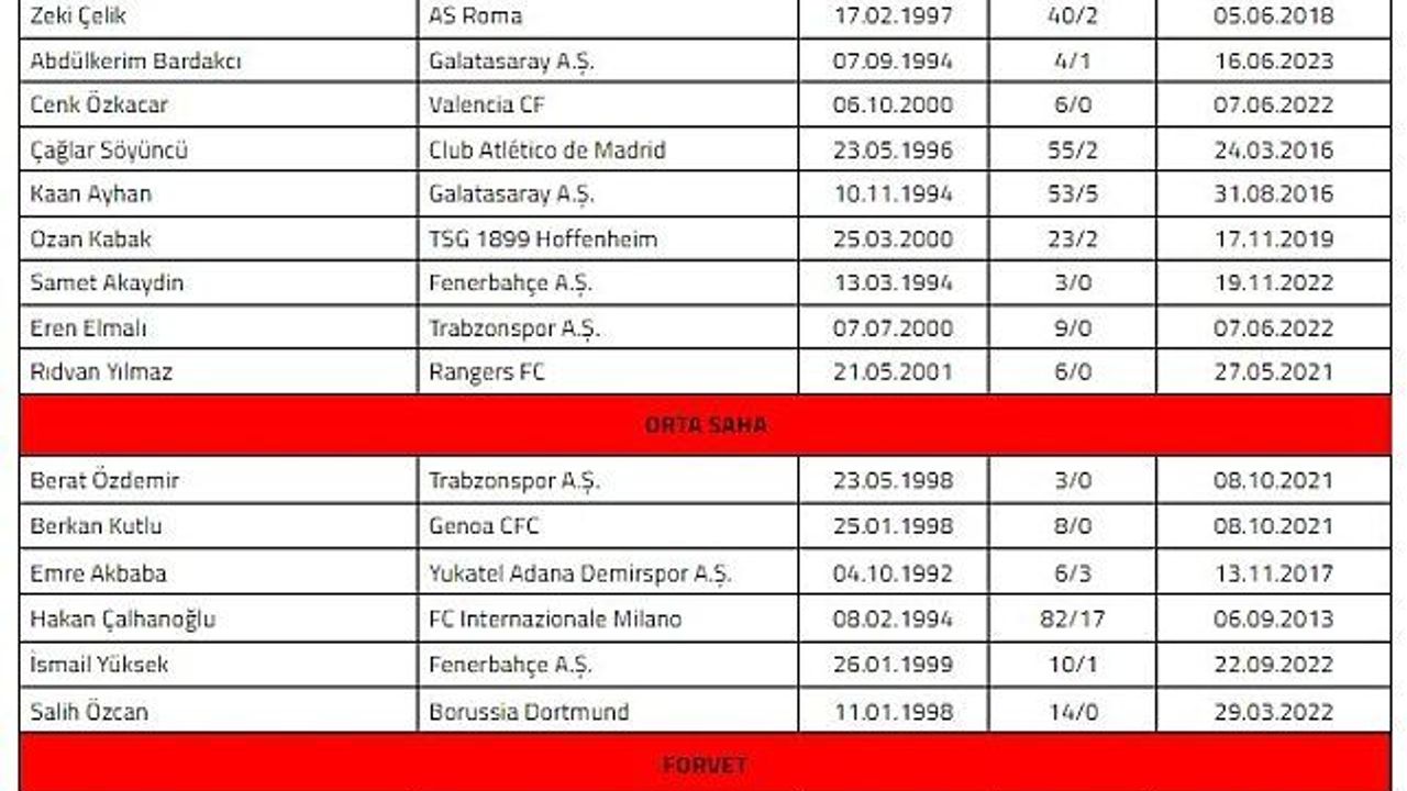 A Milli Takım Teknik Direktörü Vincenzo Montella tarafından belirlenen kadroda yer alan futbolcular şöyle: