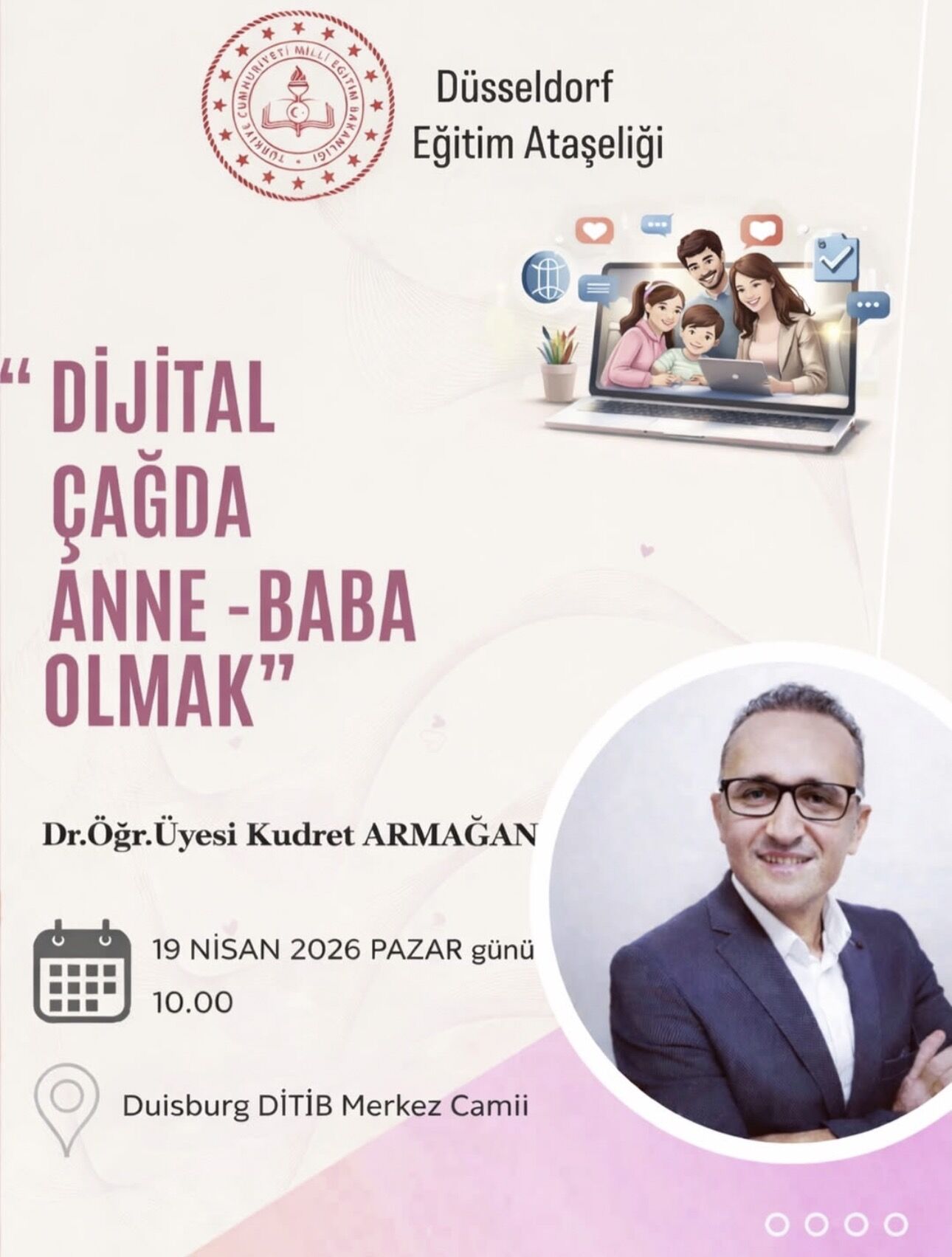 Seminer programı, Duisburg DİTİB Merkez Camii ev sahipliğinde gerçekleştirilecek. İlk hafta etkinliği, akademisyen Kudret Armağan tarafından verilecek “Dijital Çağda Anne Baba Olmak” başlıklı interaktif seminerle başlayacak.