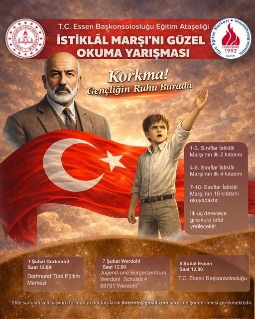 Dereceye giren öğrencilerin ödülleri, 15 Mart 2026 Pazar günü saat 12.30’da Dortmund Türk Eğitim Merkezi’nde düzenlenecek “Çanakkale Zaferi ve Şehitleri Anma Günü ile İstiklal Marşı’nın Kabulü ve Mehmet Akif Ersoy’u Anma Günü Programı” kapsamında verilecek.