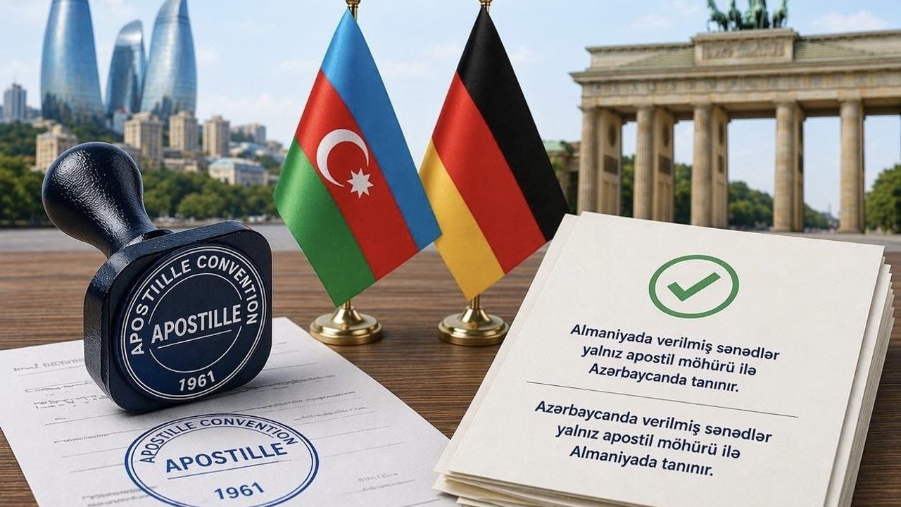 - Almanya’da düzenlenen resmi belgeler, yalnızca ilgili Alman makamlarından alınacak apostil mührü ile Azerbaycan’da geçerli olacak. Bu belgeler için Azerbaycan’ın Berlin Büyükelçiliği’nde ayrıca yasallaştırma yapılmasına gerek kalmayacak.
