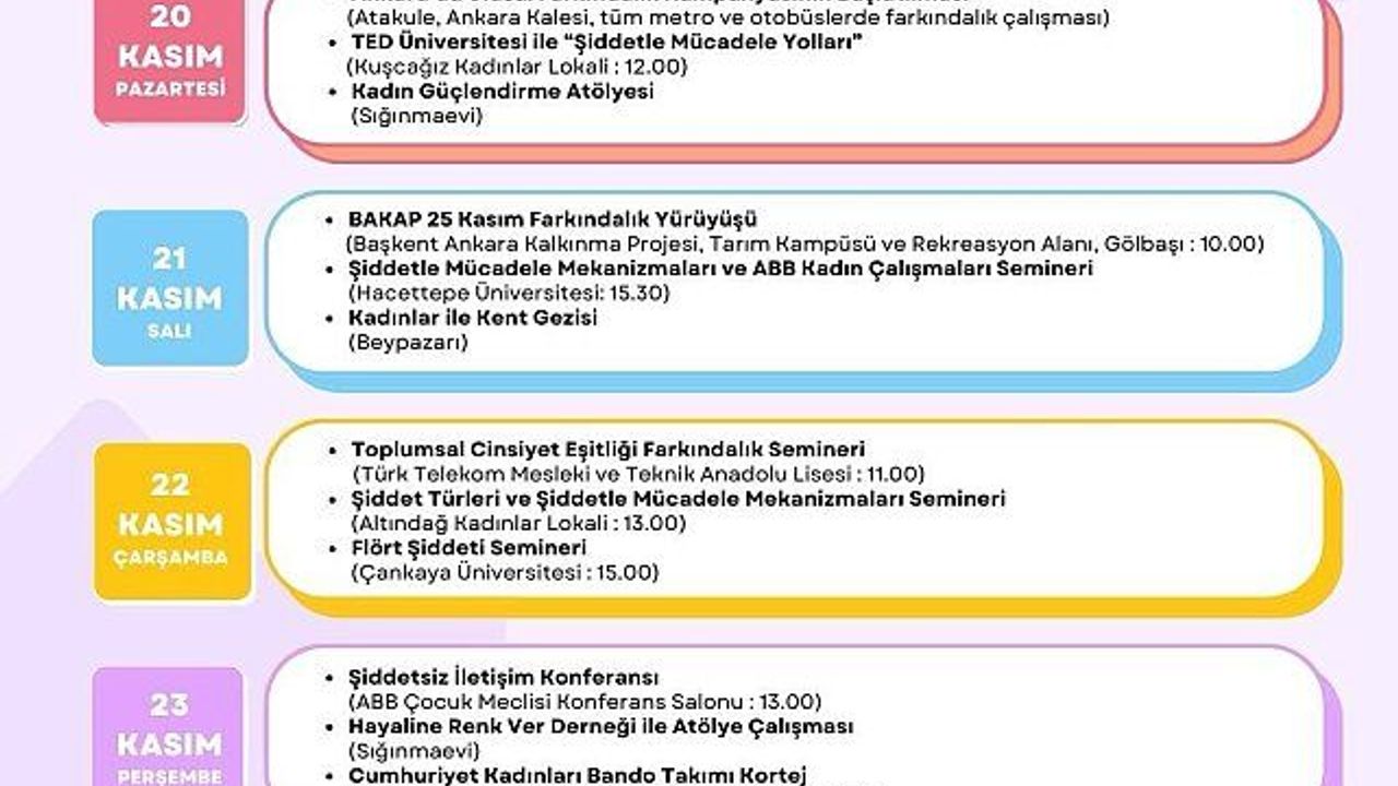 20 Kasım Pazartesi: Ankara'da ulusal farkındalık kampanyasının başlatılması, Atakule, Ankara Kalesi, tüm metro ve otobüslerde farkındalık çalışması TED Üniversitesi ile 'Şiddetle Mücadele Yolları' Kuşcağız Aile Yaşam Merkezi Kadınlar Lokali saat 12.00. Kadın Güçlendirme Atölyesi Sığınmaevi 21 Kasım Salı Gölbaşı BAKAP 25 Kasım Farkındalık Yürüyüşü saat 10.00. Şiddetle Mücadele Mekanizmaların ve ABB Çalışmaları Semineri Hacettepe Üniversitesi saat 15.30 Kadınlar ile kent gezisi Beypazarı saat 15.30. 22 Kasım Çarşamba Toplumsal Cinsiyet Eşitliği Farkındalık Semineri Türk Telekom Mesleki ve Teknik Anadolu Lisesi saat 11.00. Şiddet Türleri ve Şiddetle Mücadele Mekanizmaları Semineri Altındağ Kadınlar Lokali saat 13.00. Flört Şiddeti Semineri Çankaya Üniversitesi saat 15.00. 23 Kasım Perşembe. Şiddetsiz İletişim Konferansı ABB Çocuk Meclisi Konferans Salonu saat 13.00. Hayaline Renk Ver Derneği ile Atölye Çalışması Sığınmaevi Cumhuriyet Kadınlar Bando Takımı Kortej Armada Alışveriş Merkezi Hayat Sokağı saat 18.00.