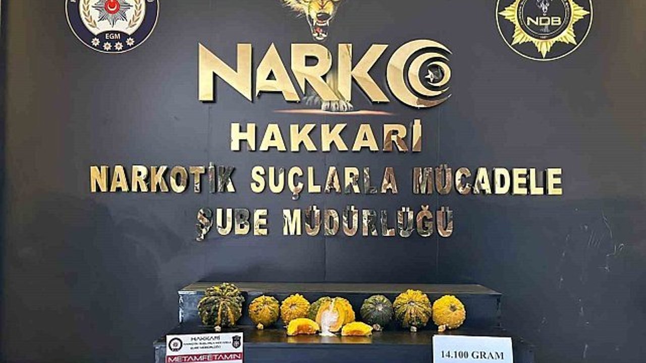 Hakkari'nin Yüksekova ilçesinde polis ekipleri tarafından yapılan aramada 7 adet bal kabağı içerisinde zulanlanmış 14 kilo 100 gram metamfetamin ele geçirildi.