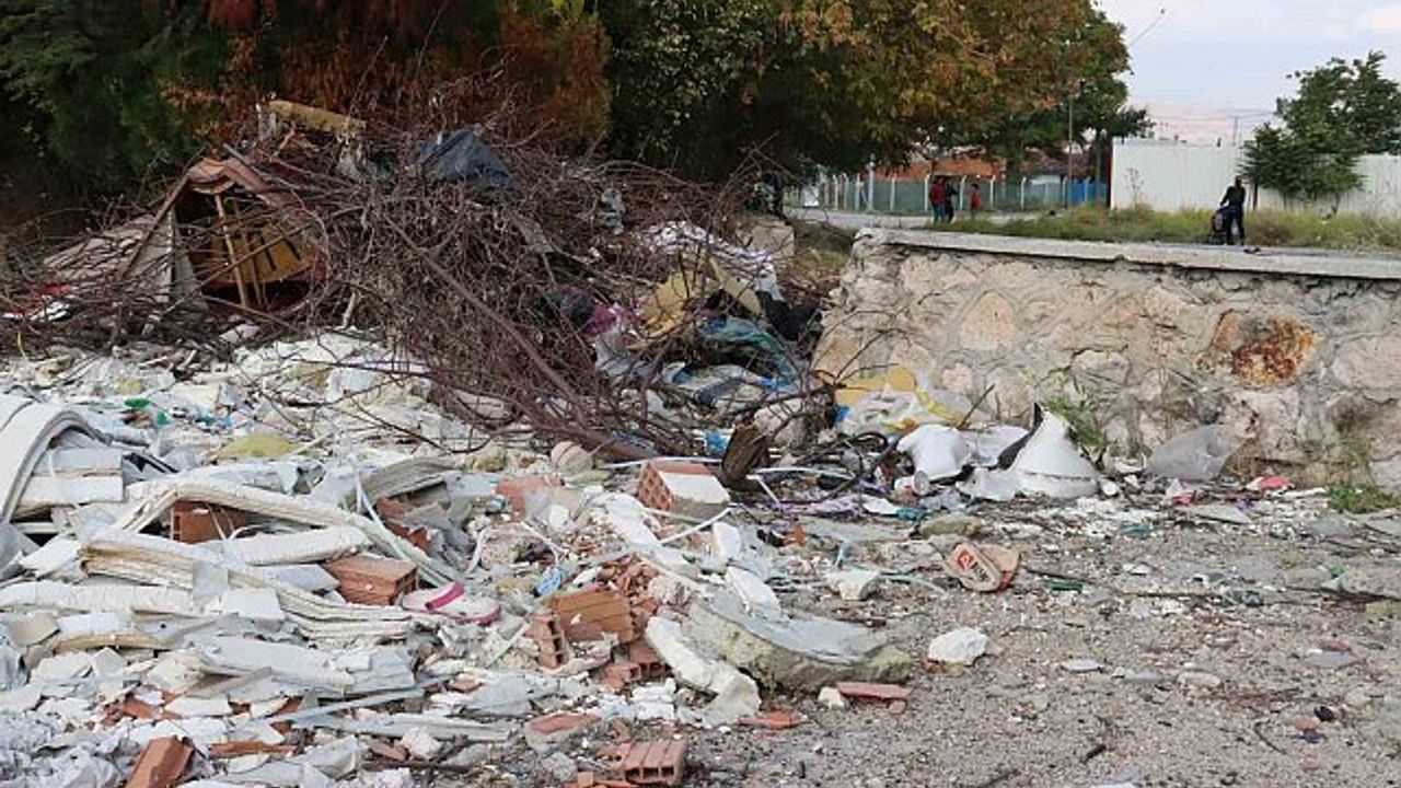 Eskişehir'de bir mahalledeki boş arazi, şuursuzca atılan atık ve molozlar sebebi ile adeta bir çöplüğü andırıyor.