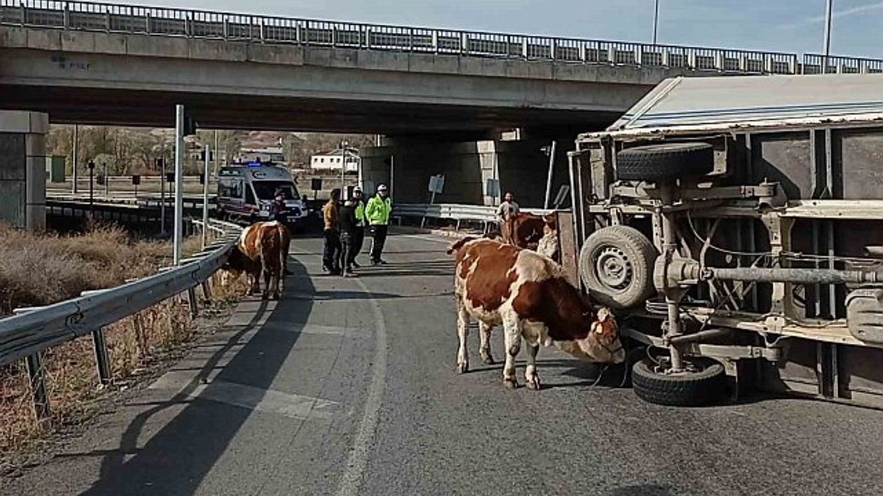 Sivas'ta büyükbaş hayvan taşıyan kamyonet devrildi, kamyonetten yola saçılan hayvanlar ot yemeye devam etti.
