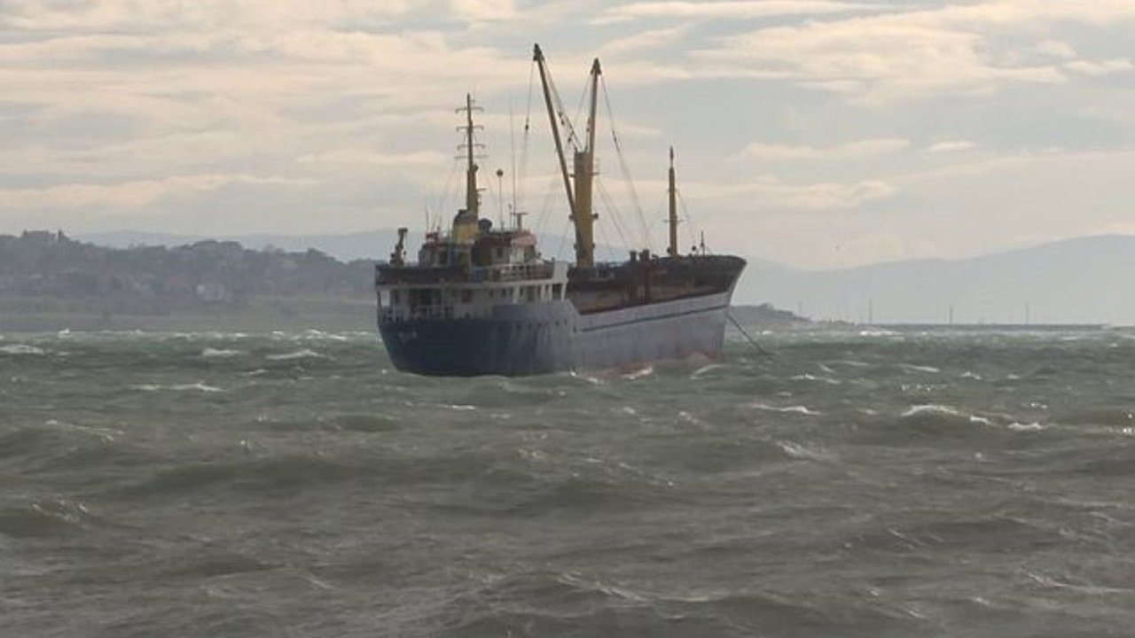 İstanbul Büyükçekmece Körfezi'ne demirleyen tonlarca ağırlığındaki gemi lodosta adeta yaprak gibi sallandı.