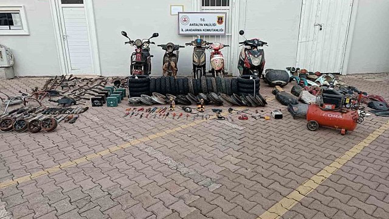 Antalya'da çalınan motosiklet ve elektrikli bisikletleri atölyesinde parçalara ayırıp boyayarak tanınmayacak hale getirdikten sonra satmayı planlayan şüpheli, jandarmanın operasyonuyla yakalandı.