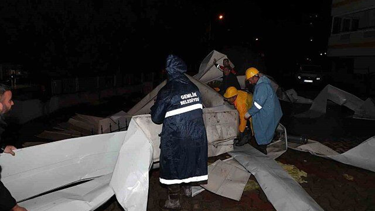 Gemlik'te akşam saatlerinde fırtınadan dolayı Cumhuriyet İlkokulu'nun çatısında bulunan kaplama uçarak çevrede bulunan araçlara zarar verdi. Belediye ekipleri kopan metal parçalar kamyonlara yükleyerek bölgeden uzaklaştırdı.
