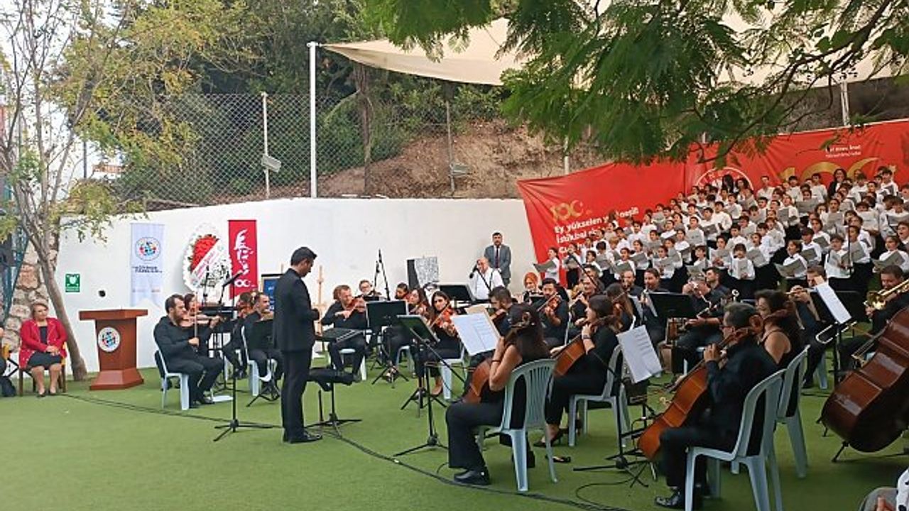 Bakırezen,'Özel Minecan Okullarının da desteği ile Minecan Okulu öğrencileri ve Topalak Köyü ilköğretim okulu öğrencileri ile birlikte Marşlarımızı seslendirdik, öğrencilerimize enstrümanlarımızı tanıttık. Çocuklarımızla birlikte coşkulu bir şekilde Cumhuriyetimizin 100. Yılını kutladık' dedi.