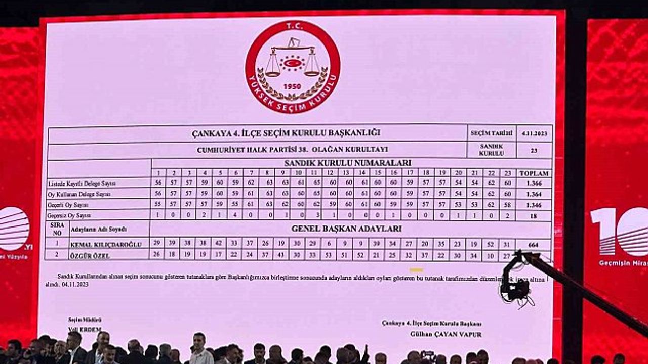 Ankara Spor Salonu'nda düzenlenen CHP'nin 38. Olağan Kurultayı'nda Kemal Kılıçdaroğlu ve Özgür Özel'in yarıştığı genel başkanlık yarışı ikinci tura kaldı. Delegelerden 682'sinin oyunu Özel, 664'ünü Kılıçdaroğlu aldı. Delege oylarında 684 olan salt çoğunluğun alınmaması nedeniyle seçim ikinci tura kaldı.