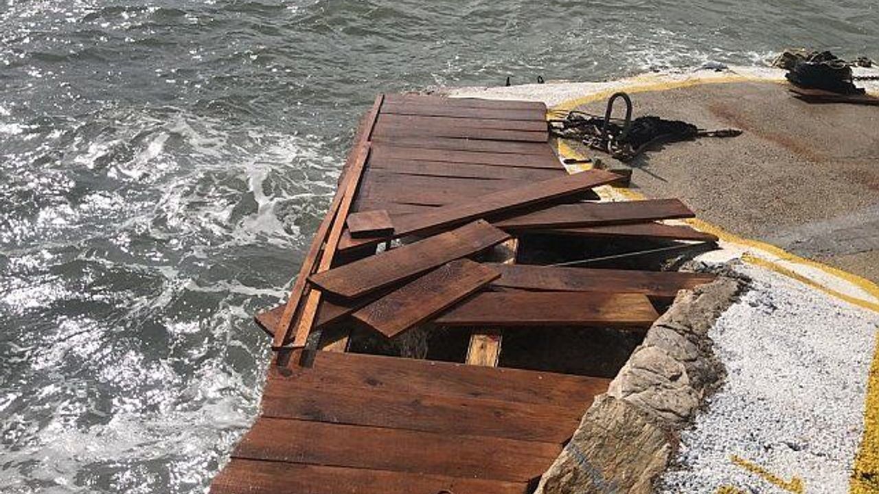 Muğla'nın Datça ilçesinde öğle saatlerinde etkili olan lodos hayatı olumsuz etkilerken, oluşan dalgalara dayanamayan tahta iskele parçalandı.