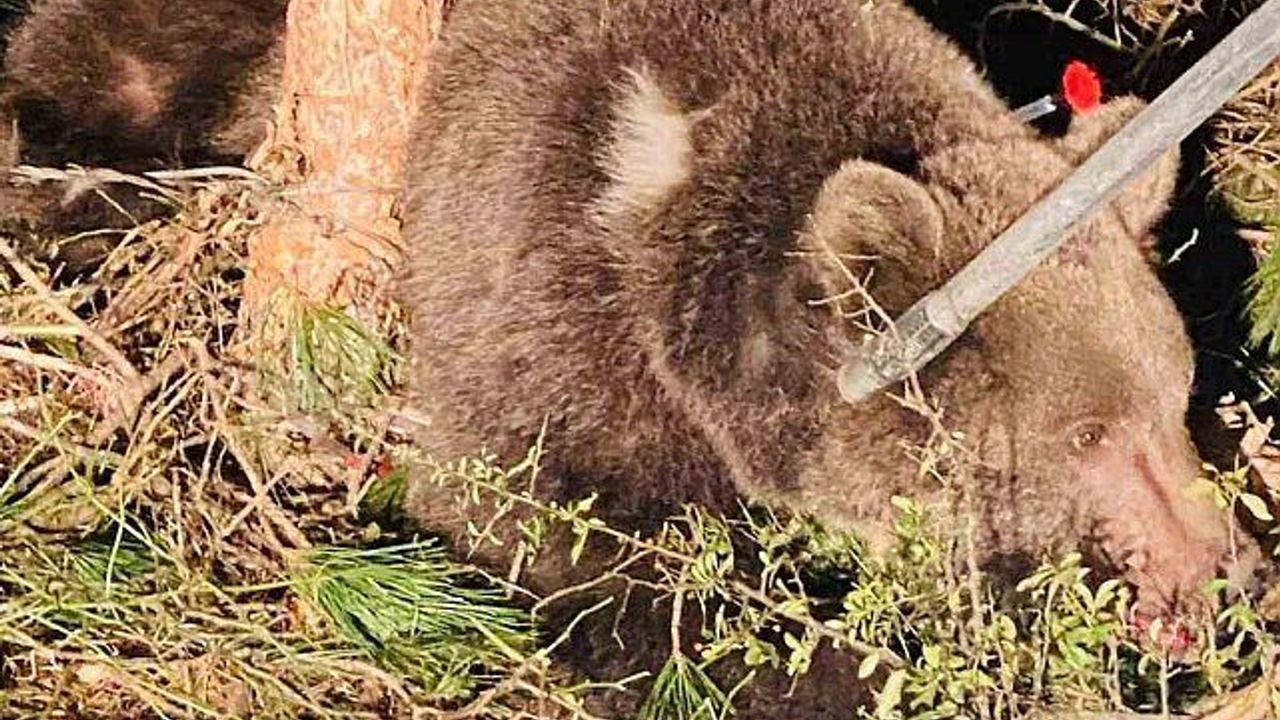 İğneler yardımıyla bayıltılan ayı dikenli tellerden kurtarılarak doğal yaşam alanına bırakıldı.