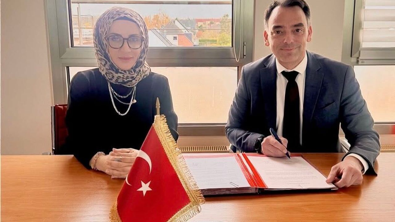 T.C. Dışişleri Bakanlığı adına Düsseldorf Başkonsolosu Ali İhsan İzbul ile T.C. Millî Eğitim Bakanlığı adına Düsseldorf Eğitim Ataşesi M. Gamze Cansu arasında e-Sınav ve Eğitim Merkezi kurulmasına yönelik protokol imzalandı.