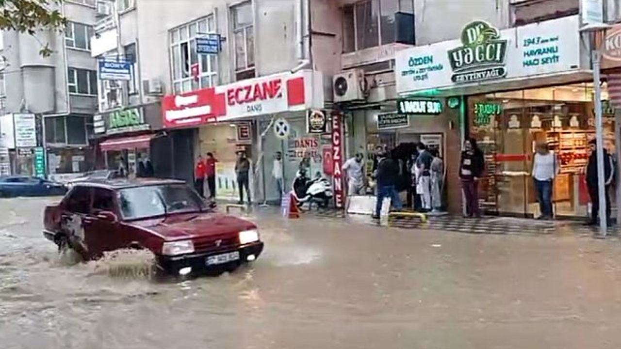 Balıkesir'in Edremit ilçesinde 5 dakikalık sağanak yağış hayatı felç etti. Yollar göle döndü, meydan sular altında kaldı. Ana caddeler çaya dönüşürken, çok sayıda işyerini su bastı.