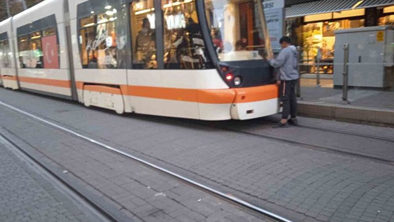 Eskişehir'de bir çocuğun, duraktan hareket etmeye hazırlanan tramvayın arka kısmına tutunma görüntüsü tepki çekti.