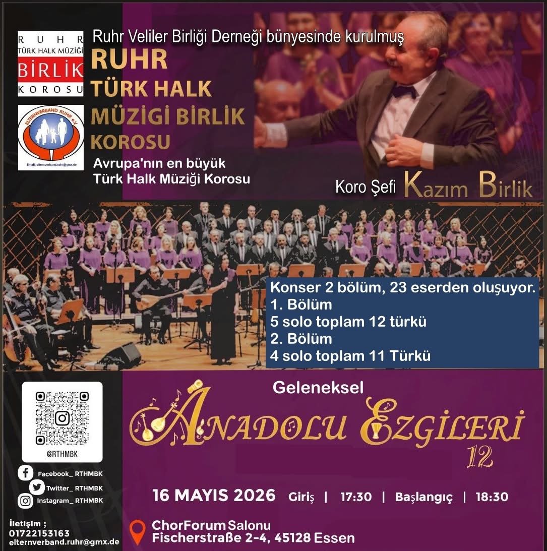 Ruhr Veliler Birliği Derneği bünyesinde faaliyet gösteren Ruhr Türk Halk Müziği Birlik Korosu, “Geleneksel Anadolu Ezgileri 12” konseriyle sanatseverlerle buluşacak.