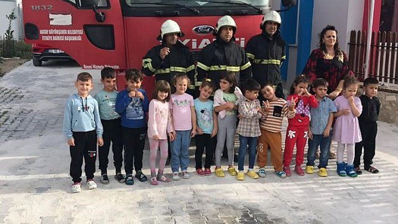 Hatay Büyükşehir Belediyesi itfaiye ekipleri, Samandağ ilçesinde bir okuldaki minik öğrencilere itfaiye eğitimi verdi.
