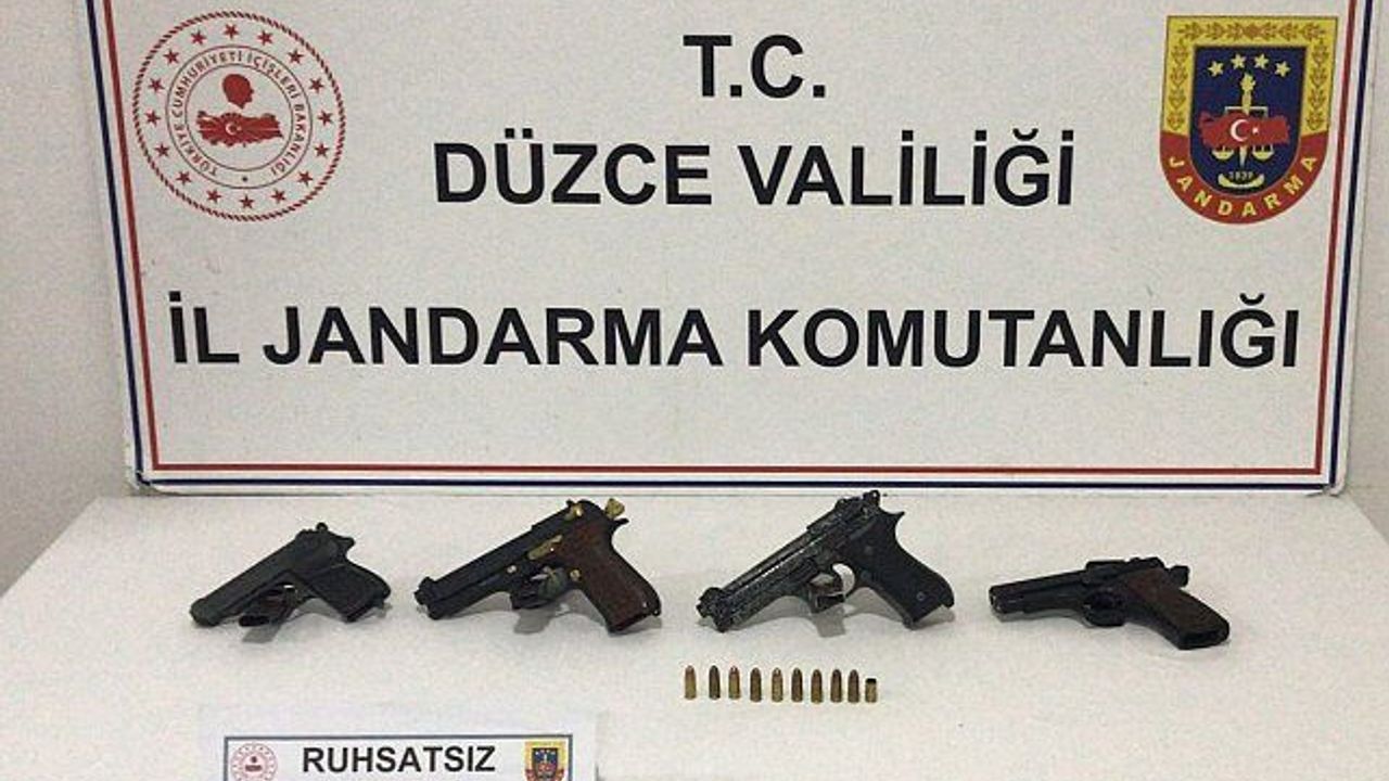 Düzce D655 karayolu üzerinde havaya ateş eden şahısların araç ve evlerinde yapılar aramada 4 adet ruhsatsız silah ele geçirildi.