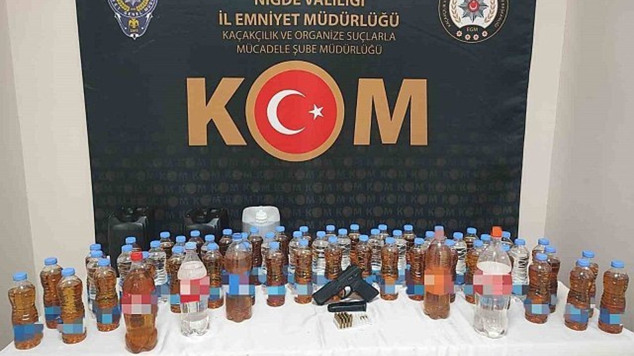 Niğde İl Emniyet Müdürlüğü Kaçakçılık ve Organize Suçlarla Mücadele Şubesi ekipleri tarafından toplum sağlığını tehlikeye düşüren ürünleri kaçak olarak yurda sokan ve satışını yapan şahıslara yönelik operasyonlar sürüyor. KOM ekiplerince 2 işyeri ve 1 ikamete yapılan operasyonda, 40 litre satışa hazır sahte alkollü içecek, 7 litre etil alkol, 1 adet ruhsatsız tabanca ve 21 adet fişek ele geçirilerek el konuldu.