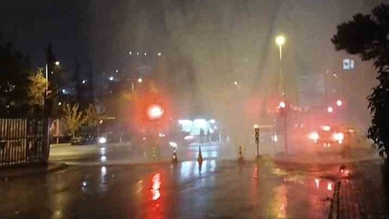 Kadıköy'de İBB'nin trafik çalışmaları kapsamında asfalt kesme makinesinin yüzeye yakın su borusuna temas etmesi sonucu su borusu patladı. Fışkıran su metrelerce yükselirken yol adeta göle döndü.