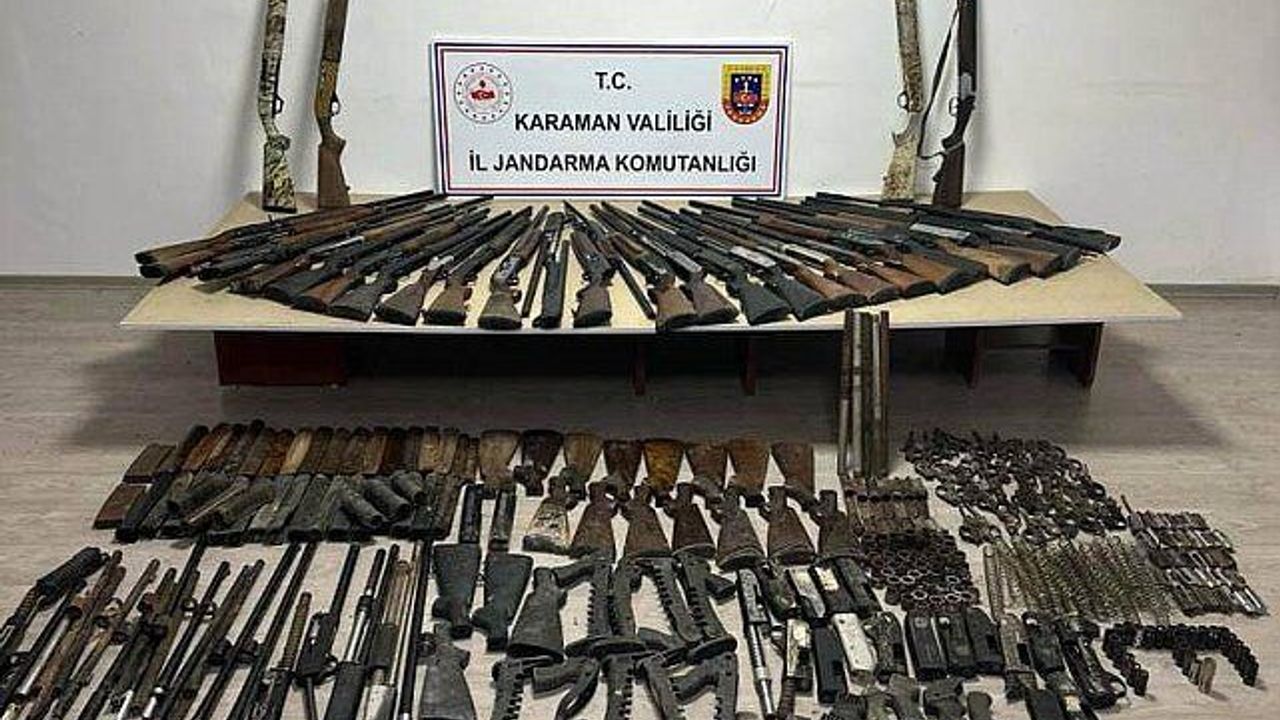 Karaman'da jandarma ekipleri tarafından yapılan denetimlerde, 30 adet ruhsatsız tüfek, 3 adet havalı tüfek ve tüfek yapımında kullanılan 343 adet çeşitli tüfek parçası ele geçirilirken, çeşitli suçlardan aranan 12 şahıs yakalandı.