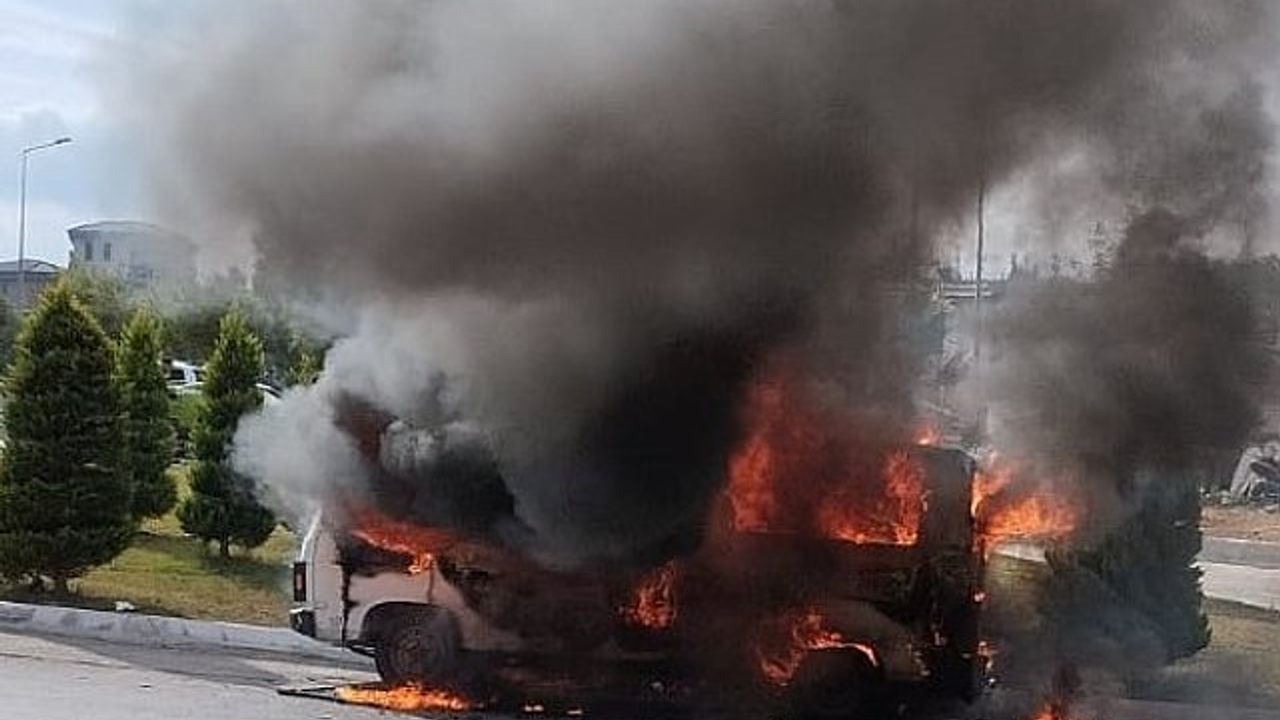 Aydın'ın Kuşadası ilçesinde Sanayi Sitesi'nde alev alarak yanan minibüs Aydın Büyükşehir Belediyesi itfaiye ekipleri tarafından söndürüldü.