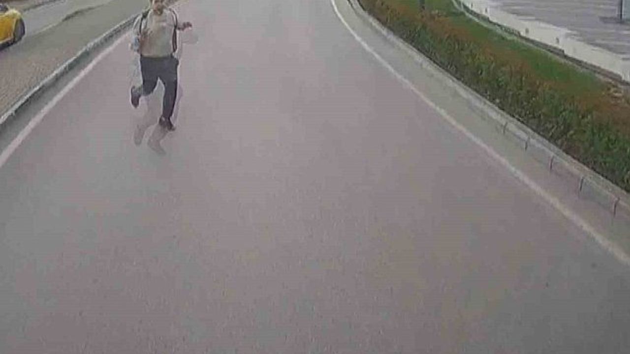 Bursa'da tartıştığı taksicilerden kaçan genç, koşarak belediye otobüsünün önüne atladı. Yolcu dolu otobüsün şoförü ise aniden fren yaparak genci mutlak ölümden kurtardı. Başını otobüsün camına çarparak yere düşen genç kazayı hafif sıyrıklarla atlattı. Kaza anı kameraya yansıdı.