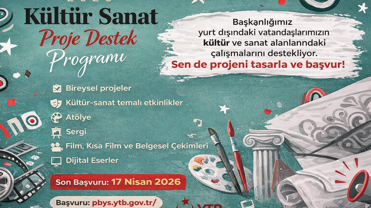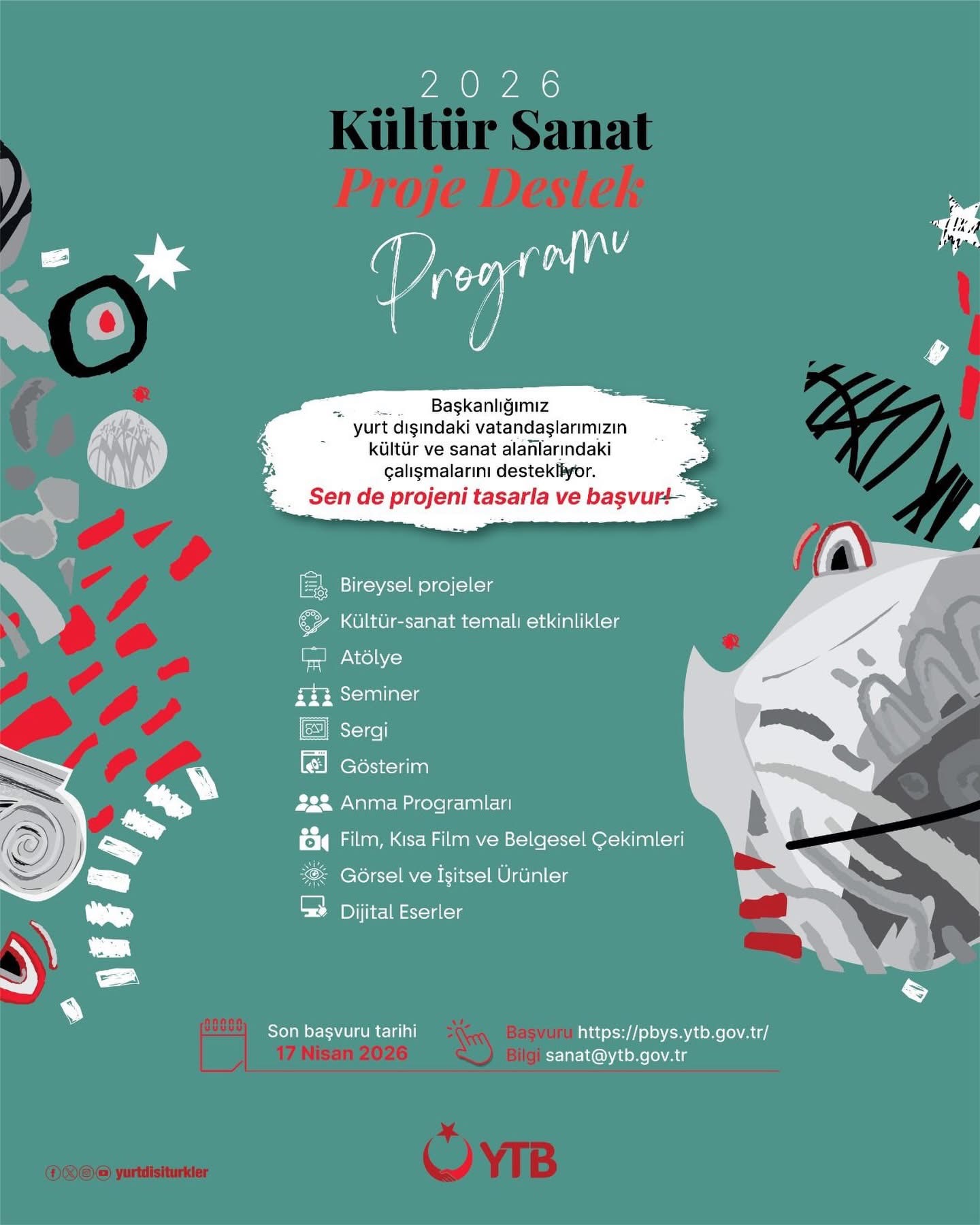 “2026 Kültür-Sanat Proje Destek Programı”na başvurular 17 Nisan 2026 tarihine kadar yapılabilecek. Programa ilişkin detaylı bilgi ve başvuru şartlarına YTB’nin resmi internet sitesi üzerinden ulaşılabilecek.